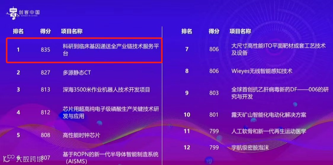 云舟生物参赛项目“科研到临床基因递送全产业链技术服务平台”,从最初的大健康专题赛,到生物医药行业复赛,再到广东省决赛,一路过关斩将每次都以第一名晋级,经过与人工智能、信息技术、智能制造、新材料等行业展开激烈角逐,最终以835分全场最高分的成绩在全国总决赛中摘得企业组桂冠,表明云舟生物的技术实力、商业能力、团队水平、发展前景等综合实力获得了各领域专家的全面及高度认可。