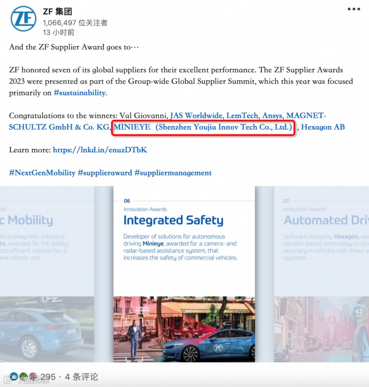 佑驾创新荣获采埃孚的“7家顶级供应商”表彰