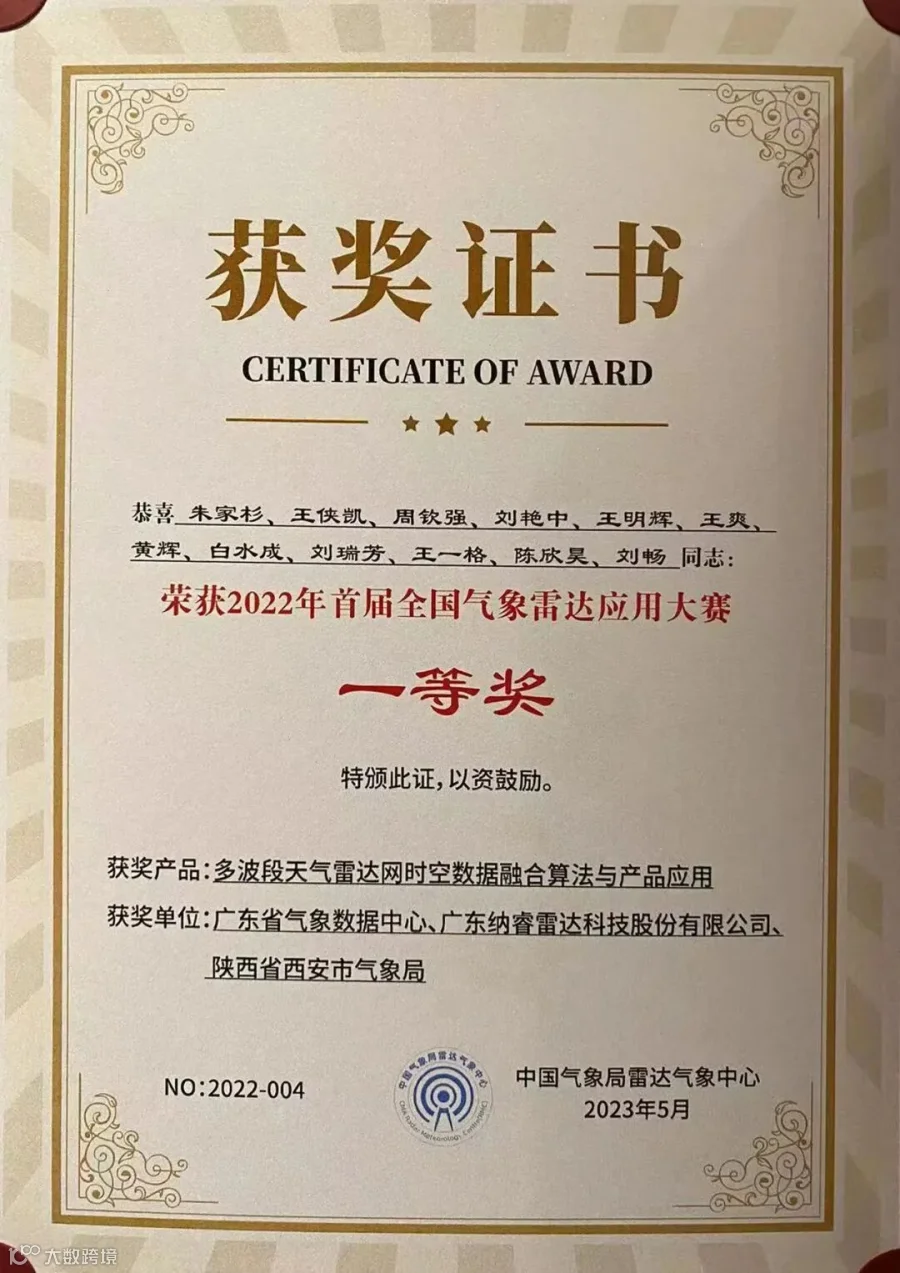 近日,穗开投资自主管理的新兴壹号基金投资企业广东纳睿雷达科技股份有限公司(以下简称纳睿雷达,股票代码:688522),联合广东省气象数据中心、陕西省西安市气象局申报了《多波段天气雷达网时空数据融合算法与产品应用》项目,在首届全国气象雷达应用大赛荣获一等奖。
