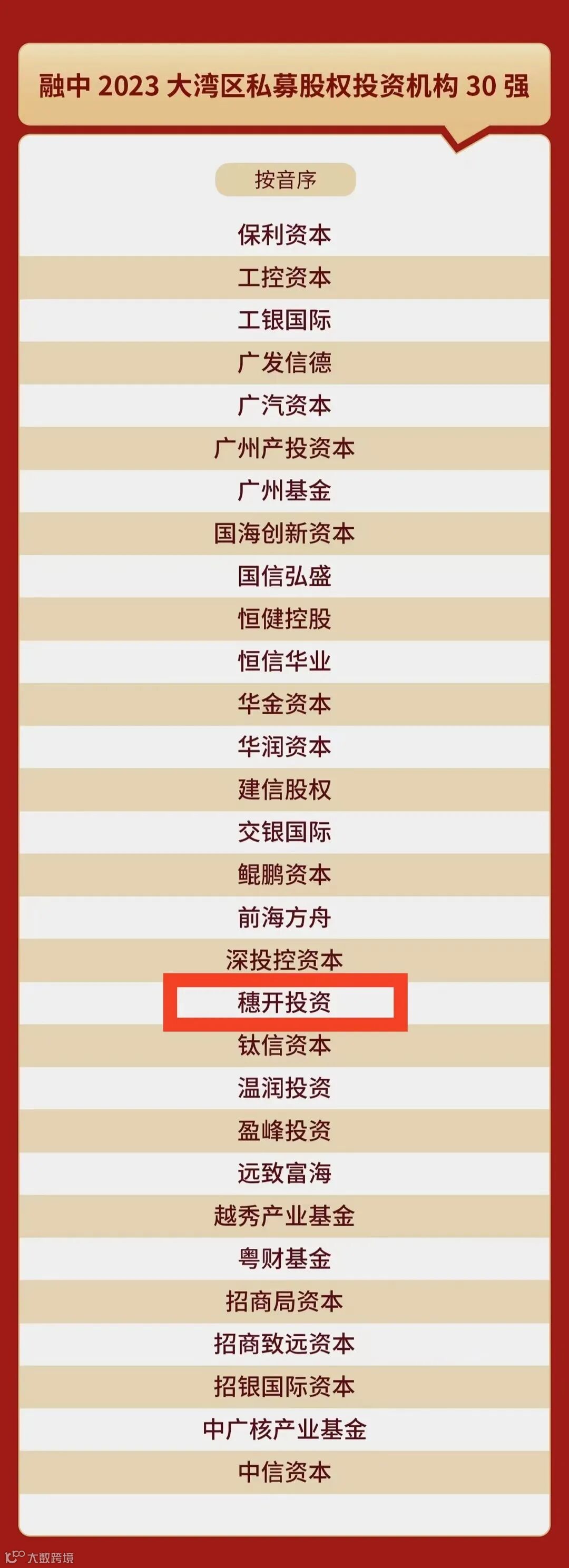 12月7日,融资中国发布了“融中2023大湾区股权投资榜单”,穗开投资荣获“2023大湾区私募股权投资机构TOP30”。