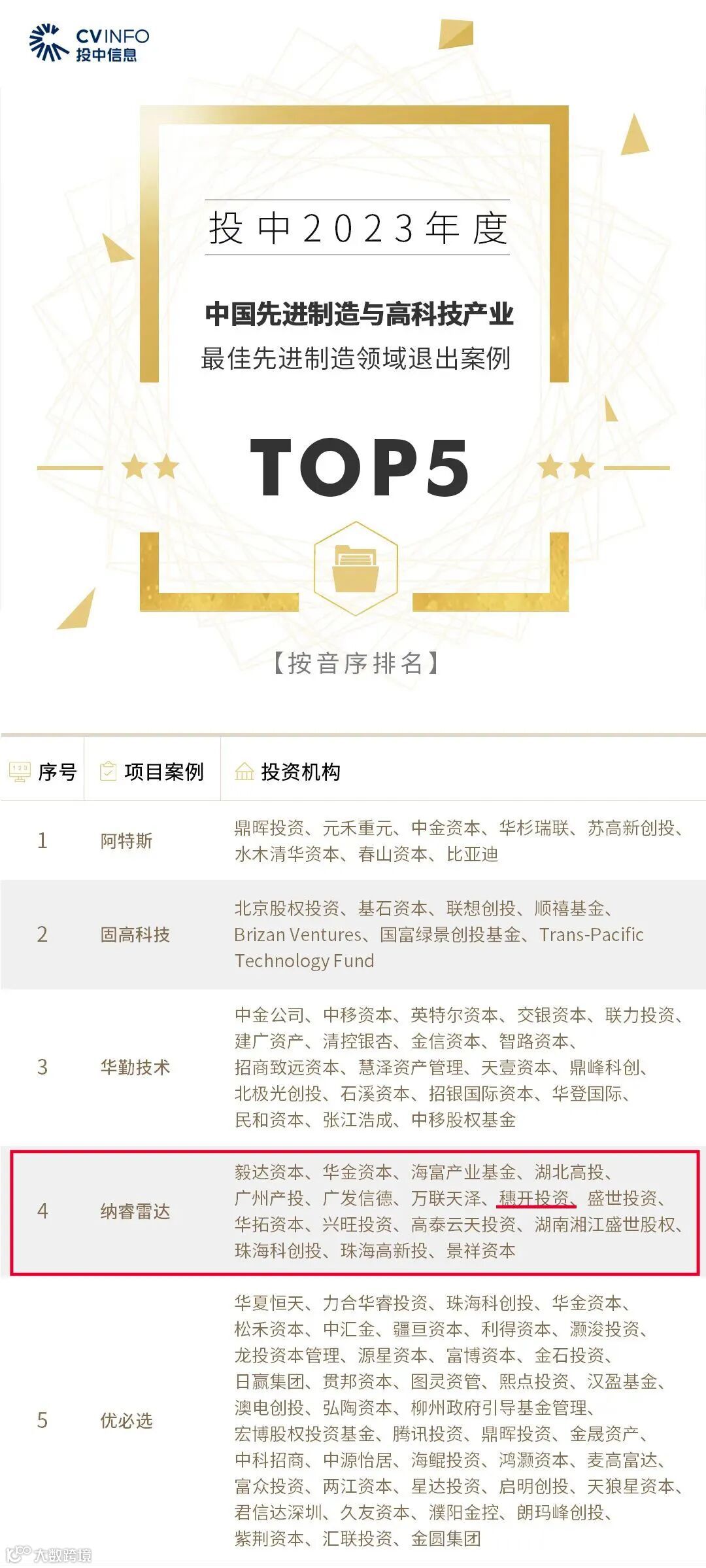 此外,穗开投资已投企业纳睿雷达(688522)也登上了本次“投中榜”,获评投中2023年度中国先进制造与高科技产业最佳先进制造领域退出案例TOP5”。