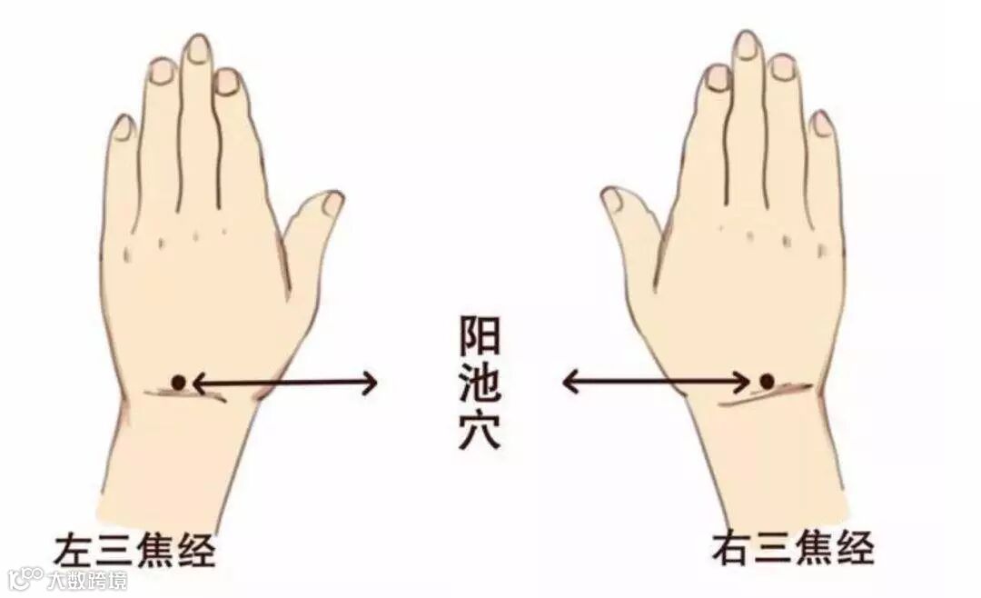 1、阳池穴:是位于手背部的穴位。将手腕背曲后,可见到腕部有一粗大的皱纹,阳池即在其中央,它也常被称为散热的穴位。一般宜用对侧手的拇指肚按压。