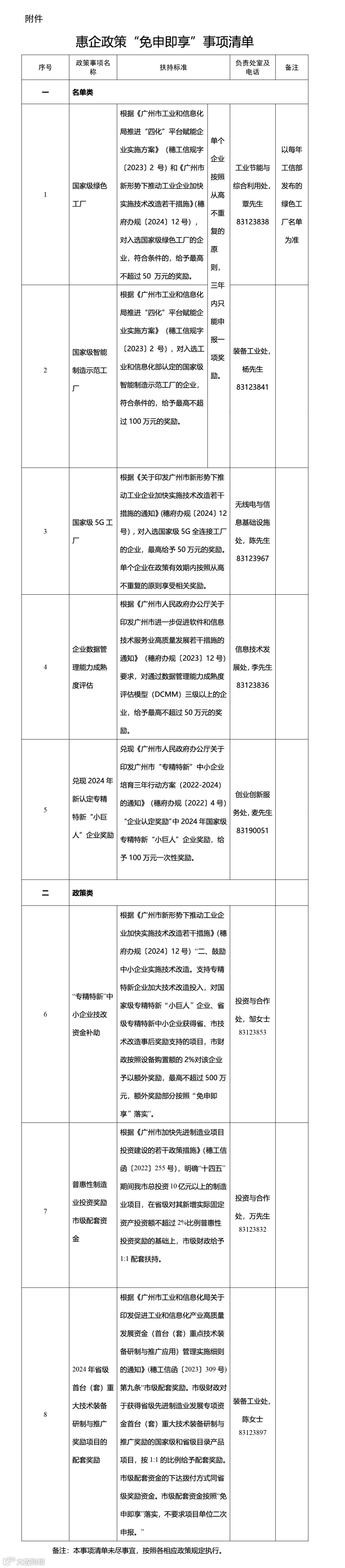 为贯彻落实《广州市工业和信息化局惠企政策“免申即享”实施方案(修订)》,我局梳理形成了一批惠企政策“免申即享”事项清单(见附件)。符合扶持标准的企业,无需提交纸质申请材料,由我局直接下达资金安排计划。