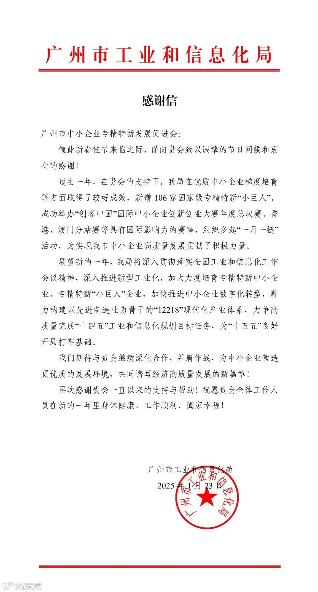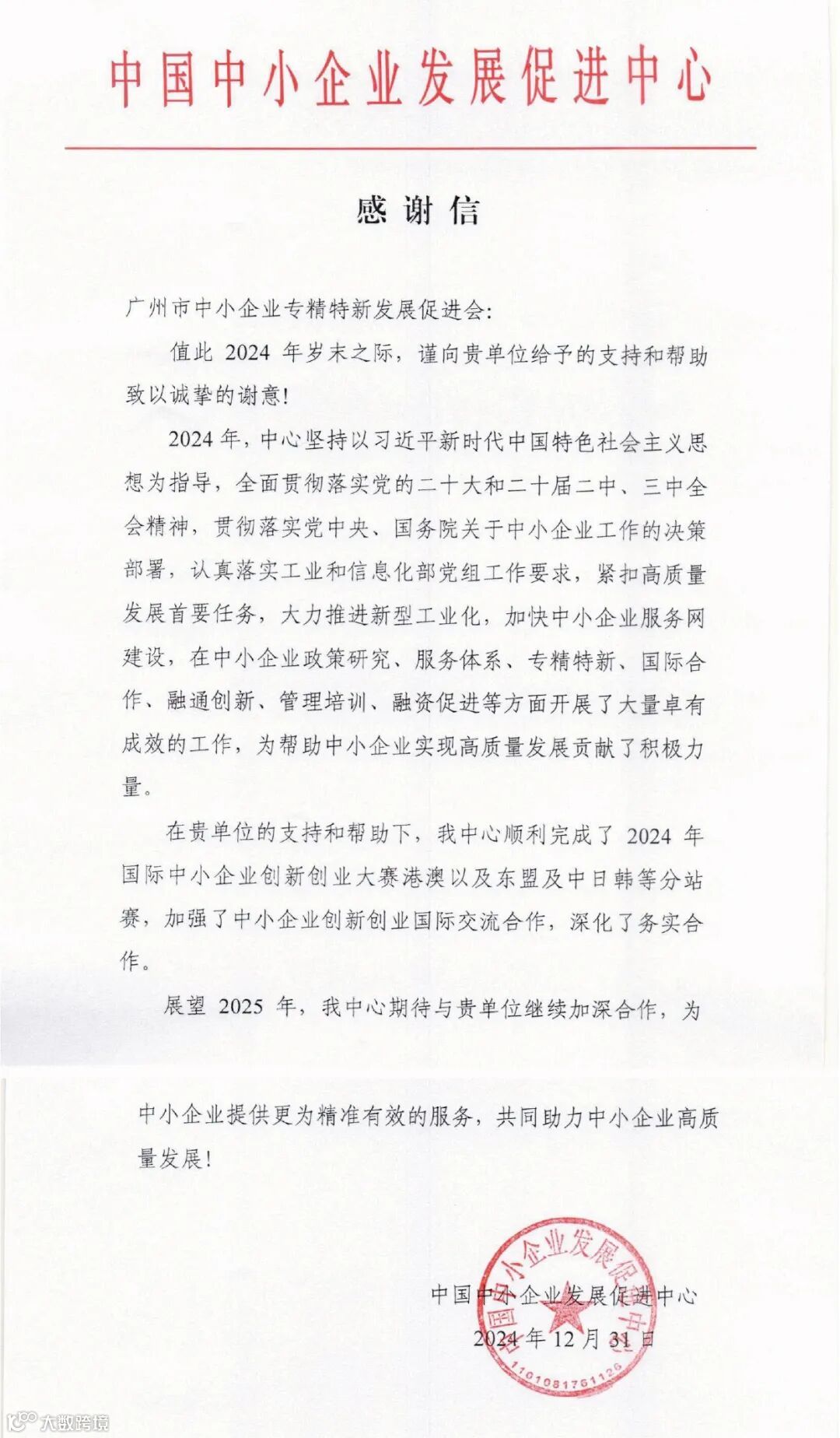 中国中小企业发展促进中心、广州市工信局感谢信。