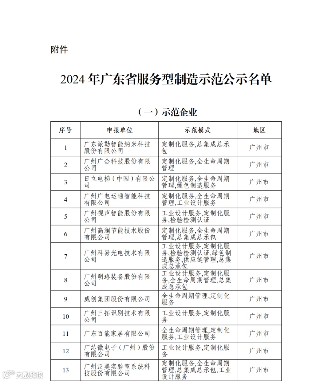 根据《广东省服务型制造示范行动工作方案》(粤工信生产合作函〔2024〕2号),为积极推动服务型制造发展,培育省级服务型制造示范单位,我厅组织了2024年广东省服务型制造示范申报评审工作。经企业自愿申报、各地级以上市工业和信息化局推荐、专家评审等程序,初步确定2024年广东省服务型制造示范名单,现予以公示。
