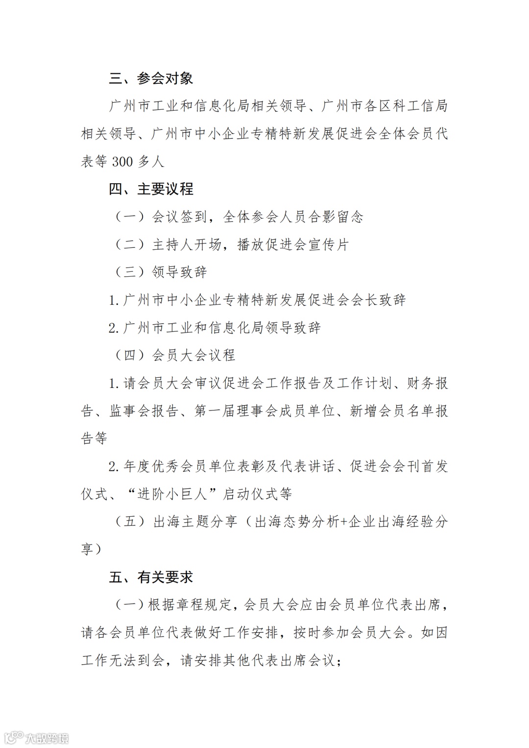 根据《广州市社会组织管理办法》、《广州市中小企业专精特新发展促进会章程》文件要求,为总结广州市中小企业专精特新发展促进会成立以来的重要工作,明确促进会今后工作的总体思路和举措,促进会拟定于10月28日在广州举行广州市中小企业专精特新发展促进会第一届第二次会员大会暨2025年度“进阶小巨人”启动仪式,大会围绕促进会工作报告和相关事务为重点进行展开,增设企业最新成果展区,促进会员单位间的深入交流。现将主要事项预通知如下: