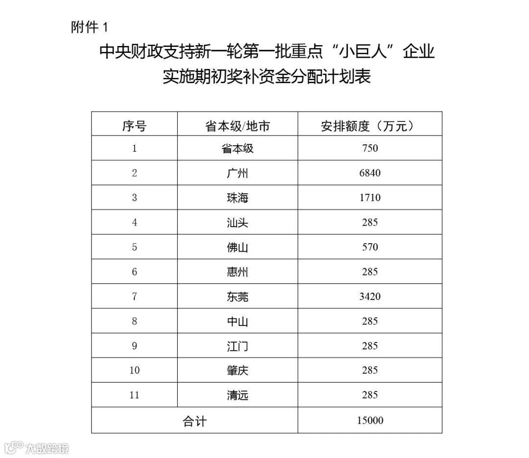 广东省工业和信息化厅关于下达中央财政支持新一轮第一批重点“小巨人”企业实施期初奖补资金安排计划的通知