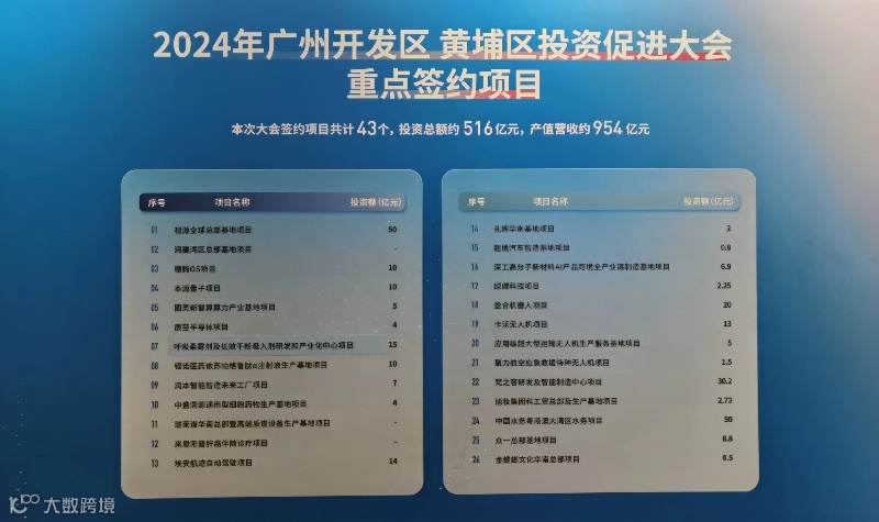 在这场“开门红”的大会上,广州开发区、黄埔区一举摘下累累硕果。会上,两批重点项目进行集中签约,其中,视源全球总部、埃安航迹自动驾驶、卡沃无人机等单个项目投资超10亿元。43个签约项目投资总额约516亿元,预计产值营收约为954亿元。