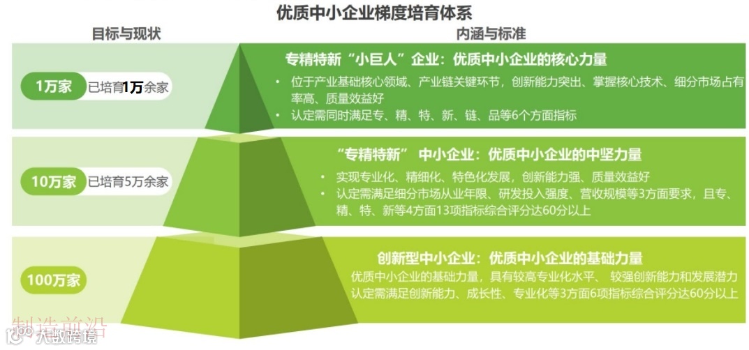 “专精特新”的培养目标是在《“十四五“促进中小企业发展规划》中提出的“百十万千”,即推动形成一百万家创新型中小企业、十万家“专精特新”中小企业、一万家专精特新“小巨人”企业,一千家制造业单项冠军。