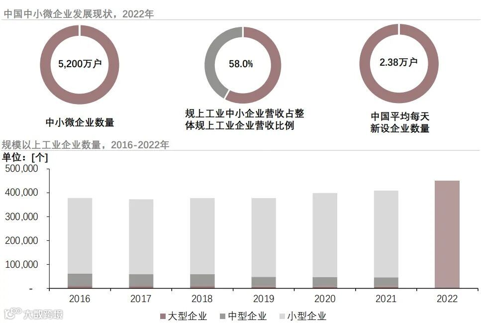 从量的方面看,中小企业数量规模快速壮大。截至2022年末,中国中小微企业数量已超过5200万户,比2018年末增长51%。规模以上工业中小企业营收在整体规模以上工业企业营收中的占比为58%。2022年平均每天新设企业2.38万户,是2018年的1.3倍。中小企业快速发展壮大,是数量最大、最具活力的企业群体,是中国经济社会发展的生力军。