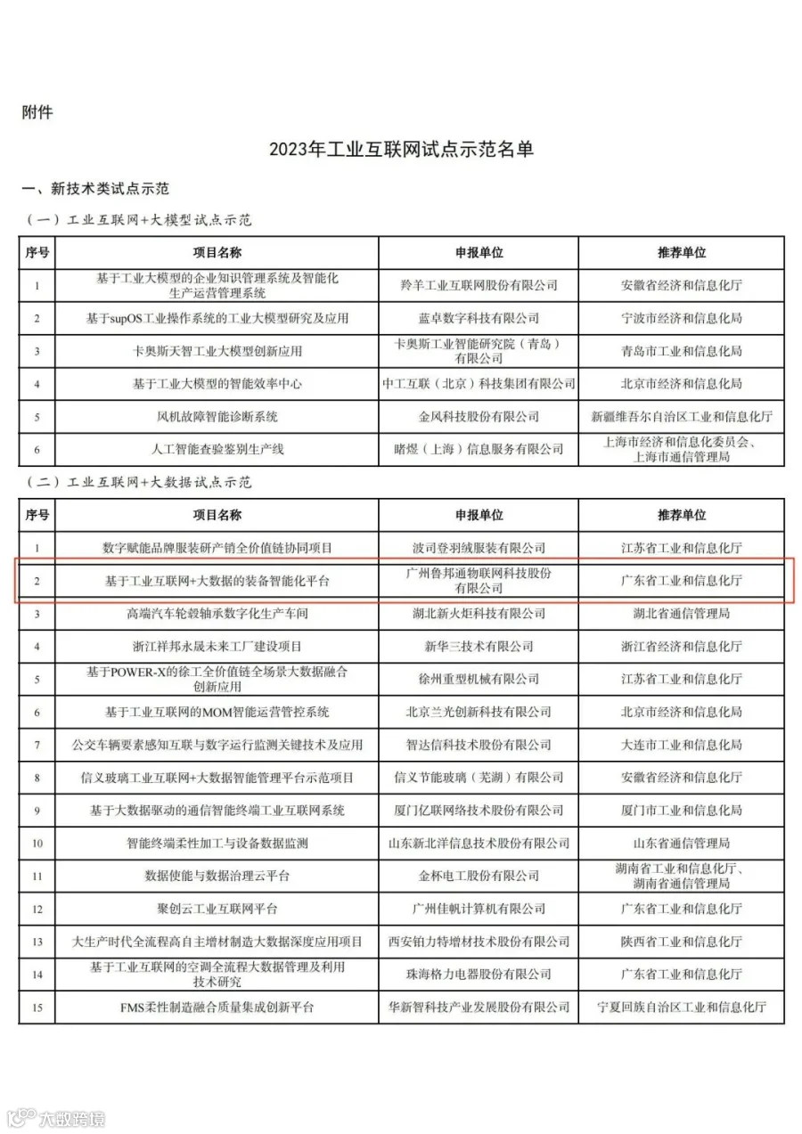 根据《工业和信息化部办公厅关于组织开展2023年工业互联网试点示范项目申报工作的通知》(工信厅信管函〔2023〕319号)要求,经企业自主申报、地方推荐、专家评审和网上公示,确定了 2023 年工业互联网试点示范项目名单,现予以公布。