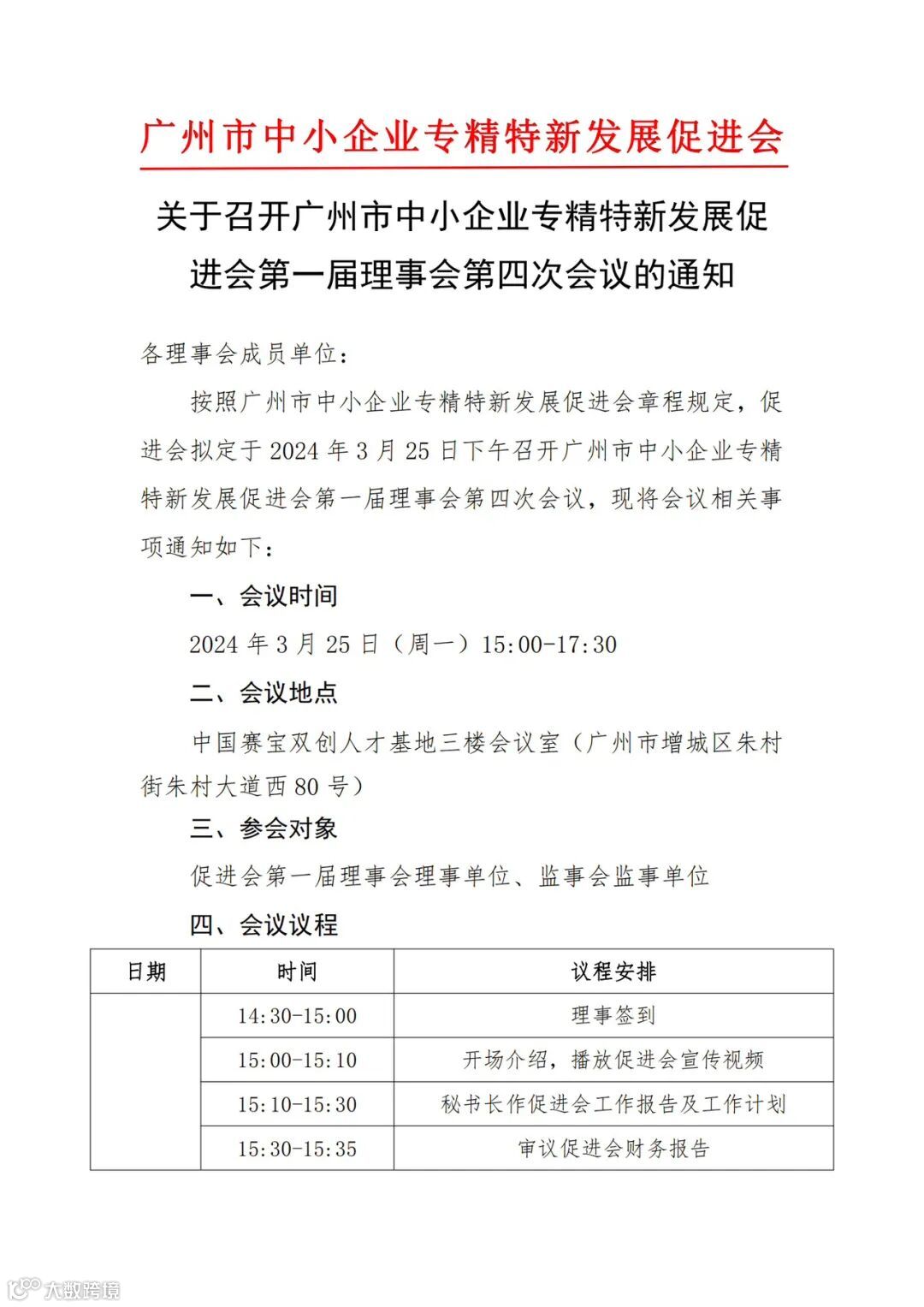 关于召开广州市中小企业专精特新发展促进会第一届理事会第四次会议的通知
