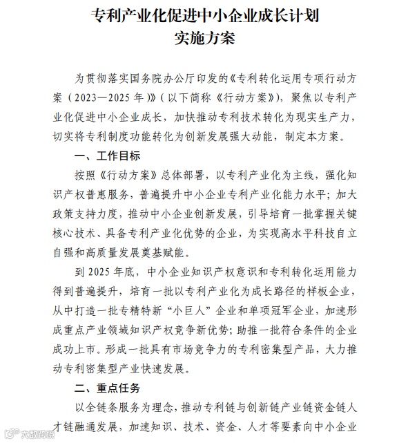 为贯彻落实中共中央、国务院印发的《知识产权强国建设纲要(2021—2035年)》和国务院印发的《“十四五”国家知识产权保护和运用规划》部署,推进落实国务院办公厅印发的《专利转化运用专项行动方案(2023—2025年)》有关专项任务,决定实施专利产业化促进中小企业成长计划,现将《专利产业化促进中小企业成长计划实施方案》印发给你们,请结合实际,认真遵照执行。请各地方知识产权管理部门会同相关部门,组织相关企业登录中小企业专利产业化系统(网址:smes.patentnavi.org.cn)进行申报,并于2024年6月15日前在系统内完成企业推荐工作。