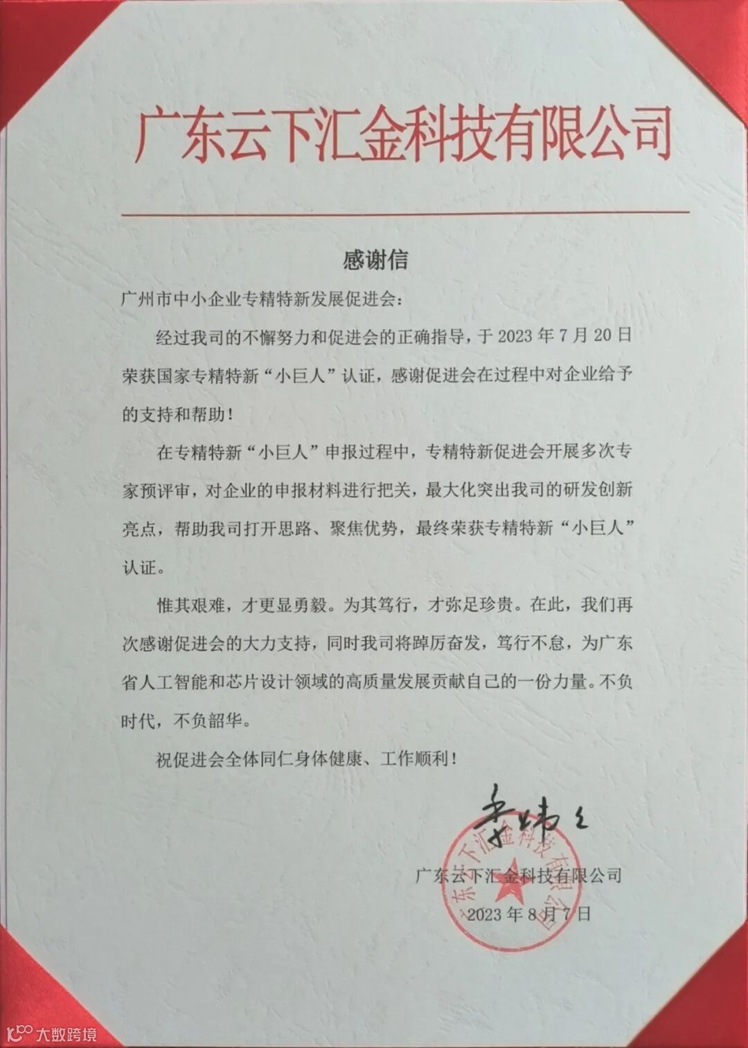8月23日,促进会收到来自第五批国家级专精特新“小巨人”企业——广东云下汇金科技有限公司(以下简称“云下科技”)送来的感谢信,感谢促进会对云下科技的申报辅导服务以及优质活动的推送。