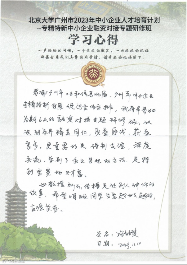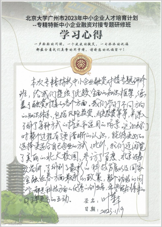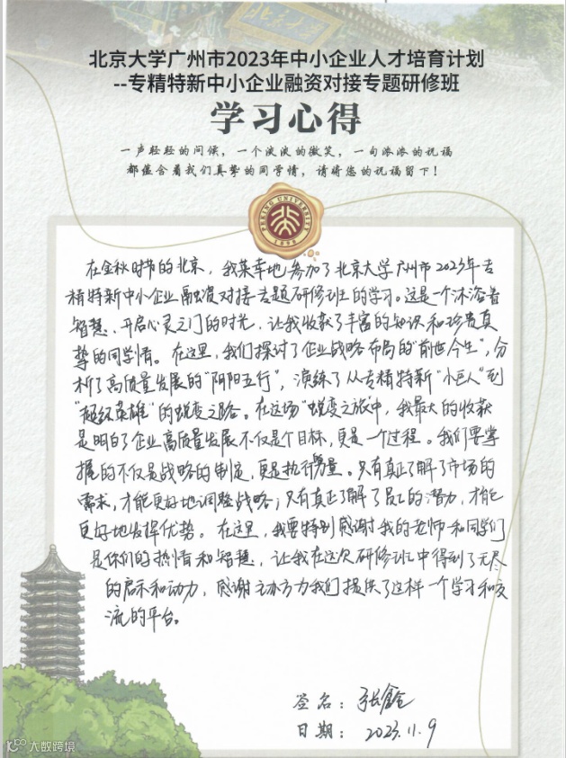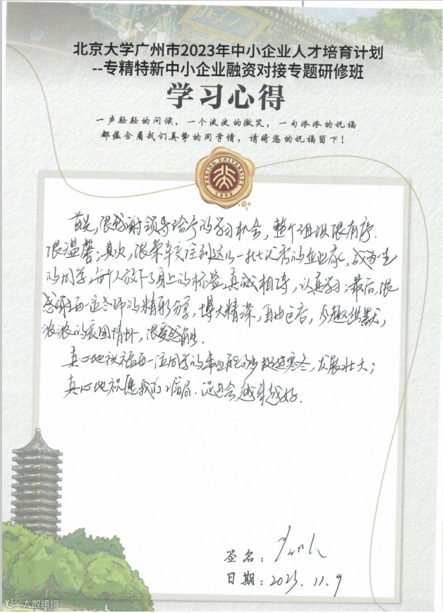 “2023年中小(民营)企业人才培育计划——专精特新中小企业融资对接专题研修班”于2023年11月5日-10日在北京大学成功举办,来自广州市各个行业的优质中小企业代表参加了本次研修班。