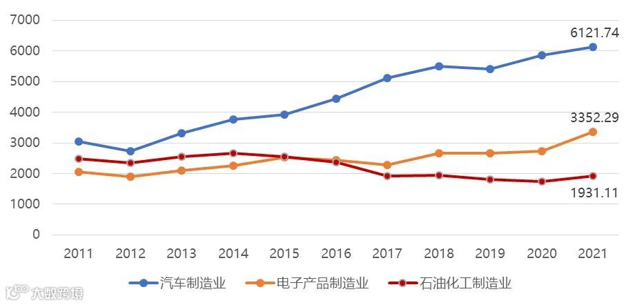 盈利“石”化:石化产值在广州传统三大支柱产业中处于末位,2021年其在广州工业总产值中占比为8.35%,低于电子产品制造业的14.50%和汽车制造业的26.48%。通过对三大支柱产业近10年产值变化分析发现,自2014年起,石化的工业产值呈逐年下降趋势,已成为三大支柱产业中盈利能力最弱的产业。