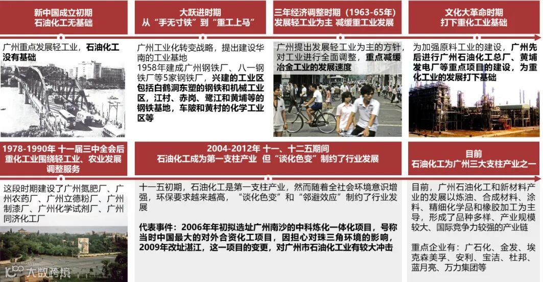 石化产业并不是广州历史传统产业,以1958年广州钢厂等涉化企业的建设为起点,广州石油化工总厂建设为标志,其发展经历了从无到有到支柱产业的过程。