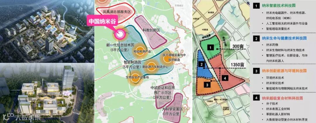 中国纳米谷:未单独设置大型的材料园区,而是与应用端结合,布局在新一代信息技术园内,并与周边的科教创新区、智能制造园毗邻,与科研和应用端紧密联系,相互促进。