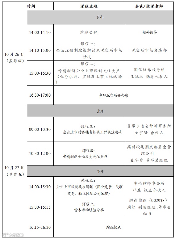 本次培训为广东股权交易中心、深交所创业企业培训中心为广东省“专精特新”专板企业及拟入板的省内专精特新企业开展的培训活动,采用线下培训授课的方式,为期2天。