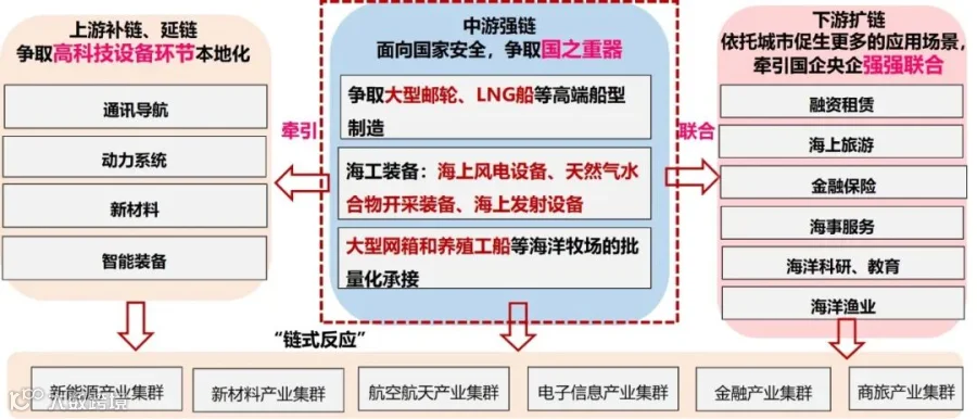 一是对接国家海洋强国战略,面向国家粮食、国防、能源、供应链安全,加强与央企集团的沟通交流,大力发展大型液化石油气船、万箱级以上集装箱船、大中型工程船舶、邮轮、养殖工船等船型,通过用地用海、政策资金等政策支持,牵引国家资源。