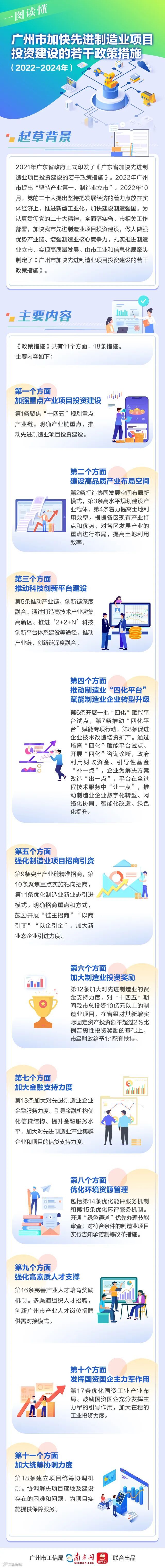 2021年广东省政府正式印发了《广东省加快先进制造业项目投资建设的若干政策措施》。2022年广州市提出“坚持产业第一、制造业立市”。2022年10月,党的二十大提出坚持把发展经济的着力点放在实体经济上,推进新型工业化,加快建设制造强国。为认真贯彻党的二十大精神,全面落实省、市相关工作部署,加快我市先进制造业项目投资建设,做大做强优势产业链、增强制造业核心竞争力,扎实推进制造业立市、实现高质量发展。由市工业和信息化局牵头制定了《广州市加快先进制造业项目投资建设的若干政策措施》。