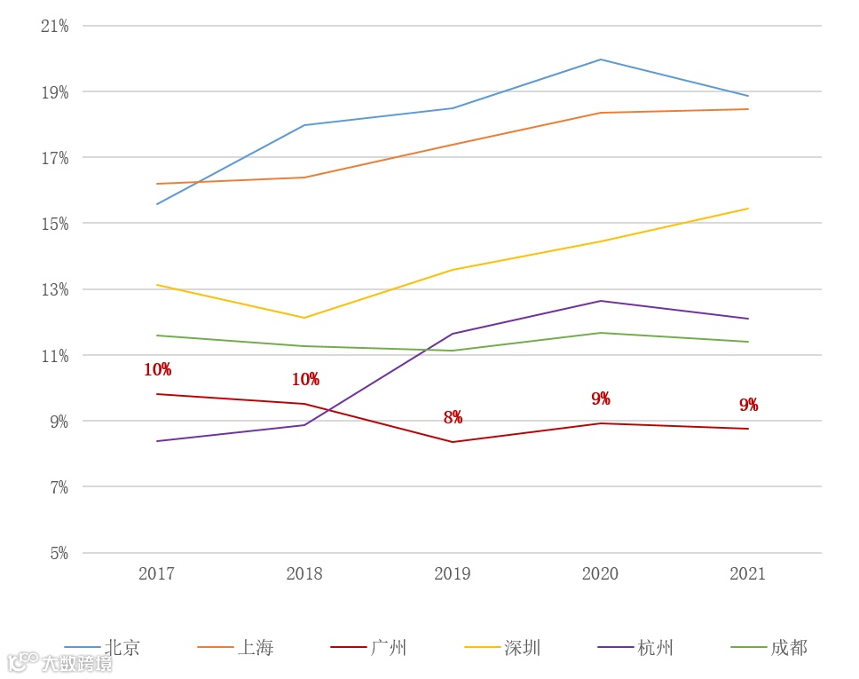 广州金融业在全市GDP中的占比长期稳定在8%-10%左右,低于北京、上海、深圳等城市。金融并非主导型产业,而更多在城市经济发展中发挥“稳压支撑”作用,服务于实体经济等产业发展。