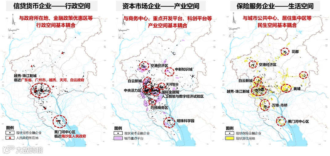 从空间布局上看,银行等信贷货币企业受政策驱动影响大,主要集中在政府部门周边。证券基金等资本市场体现市场导向与产业驱动,与城市商务中心、重点平台以及科创平台空间耦合。保险业则更多贴近民生服务,邻近城市公共中心、居民集聚区布局。