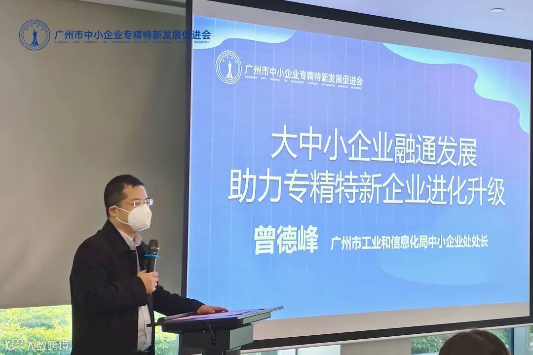 随后,促进广州市工业和信息化局中小企业处处长曾德峰就大中小企业融通发展活动的政策背景作重要讲话。曾德峰处长肯定开展大中小企业融通发展活动的重要性,指出大中小企业融通,是释放大企业创新活力、激发中小企业创新潜力的一个有效渠道,是提升产业链供应链稳定性和竞争力的重要途径,并提出经营好企业的六大战略:1.方向清晰,目标明确;2.主导产品突出,不搞大杂烩;3.按专精特新标准做好梯度培育;4.软件比硬件更重要,要加大资源整合力度,着力提升为客户赋能的能力;5.保持战略定力,久久为功;6.效率优先,提高执行力。