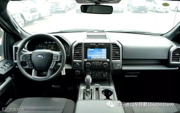 内饰方面:新款F150它的表面颇具动感,内饰奢华,配置富厚,同时兼具跑车的动力机能、越野车的全地形制霸本领和豪华轿车的乘坐恬静性,并且它的改装空间也很大。车内配备标准独特的皮革和布艺装饰的座椅,驾驶员侧的电动十向调节。这些座椅同时具备记忆功能。中央控制区搭配了触控式显示屏,其下方则是多媒体控制区及空调面板,采用旋钮+物理按键的组合。中控功能区域可分为三个小控制区,最上端为音响控制及导航控制,中间为收音机调节控制,最低端为空调及座椅加热控制。在内部空间的庞大基础上,福特也提供了非常具有舒适性与服务性的内饰配置。另外,新车还配备了一块大尺寸的全景天窗。