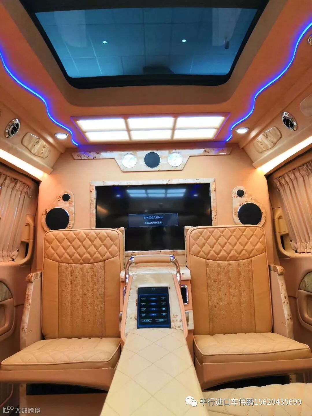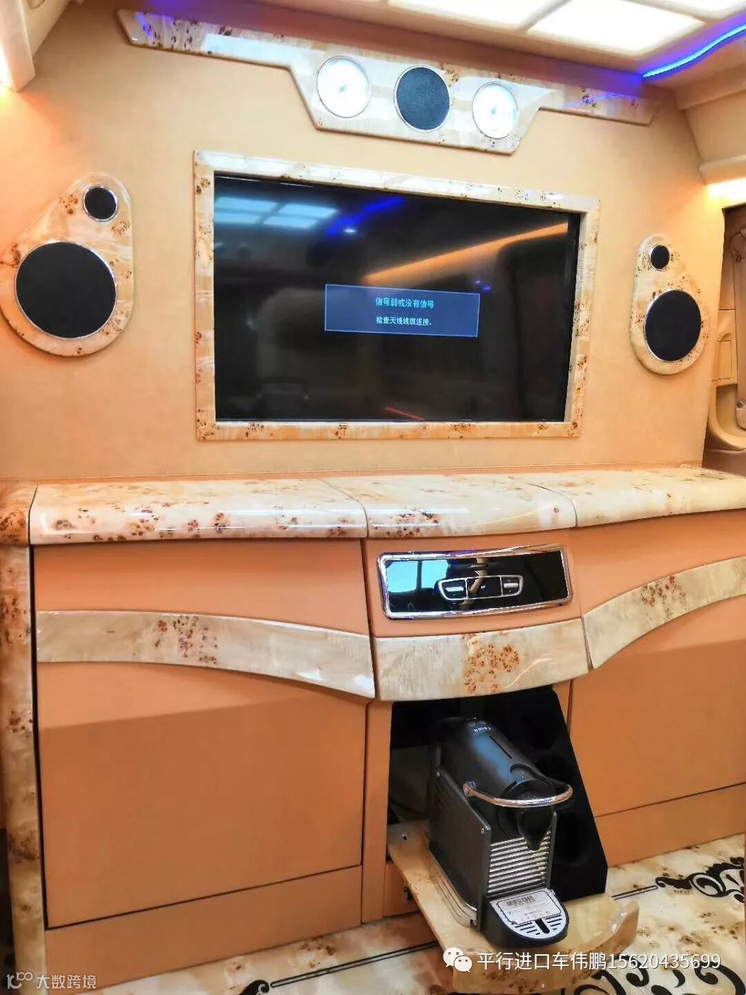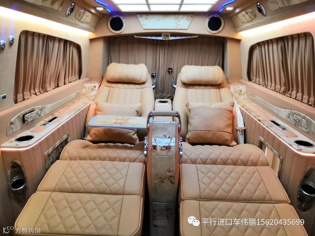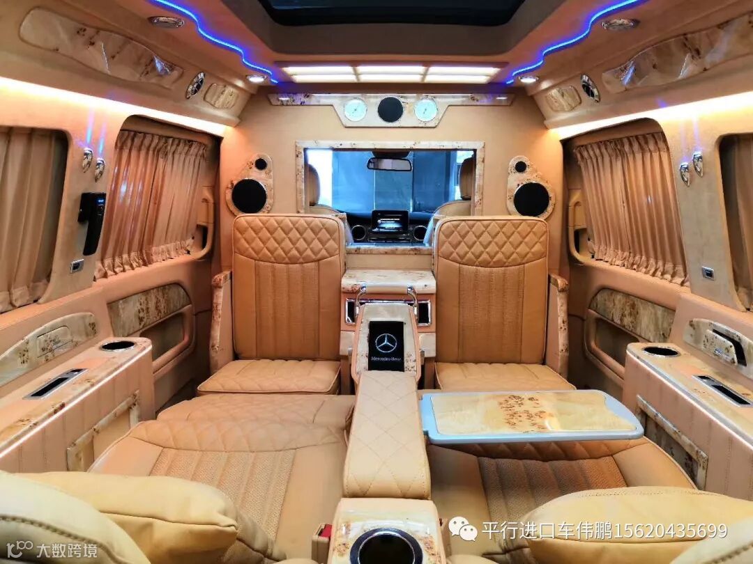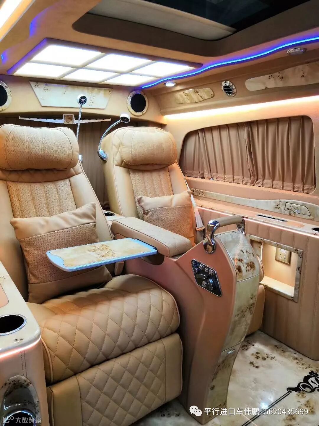 进入奔驰V250后舱,立刻就会被它的豪华绚丽而征服,驾驶舱与后舱是分隔设计的,形成两个独立的空间。中间由一台超大液晶升降电视(32寸)及柚木多功能吧台及柏林之声音响组成,整车环保真皮包裹,金网花地板铺设,豪华感无处不在。全部采用真皮制作,豪华木饰装点,装有按摩加热通风功能。后舱前为两个独立航空座椅,后为一组沙发座椅(可电动展平,形成一张舒适的沙发床)。