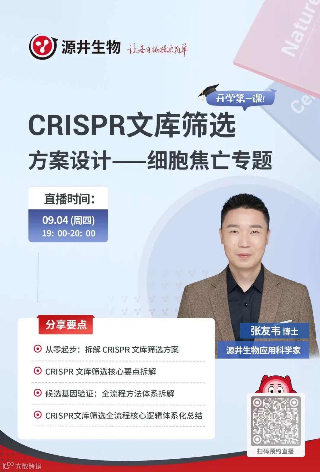 9月4日19:00,源井生物应用科学家张友韦博士将带来主题为<CRISPR文库筛选方案设计>的精彩直播。同时,我们还设置了问题答疑环节,让专家直接为您答疑解惑!