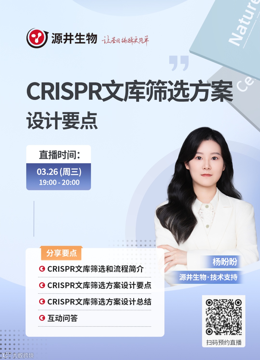 3月26日19:00,源井生物技术支持杨盼盼带来主题为<CRISPR文库 | 筛选方案设计要点解析>的精彩直播。您将掌握CRISPR文库筛选流程以及筛选方案设计要点,为科研工作注入新活力。同时,我们还设置了问题答疑环节,让您和技术专家直接对话!