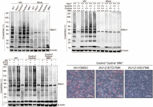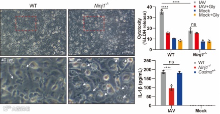一个关键发现是,在IAV诱导的PANoptosis背景下,NINJ1缺失可显著降低IL-1β的释放,而GSDMD缺失并不产生类似效应。这表明,在PANoptosis过程中,细胞因子的释放调控机制具有 通路特异性,与经典焦亡模型中“GSDMD主导IL-1β释放”的认识存在差异。