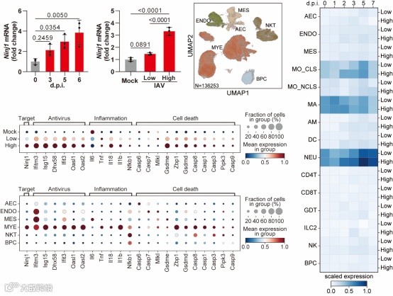 研究首先证实,IAV感染能够显著上调 NINJ1 的表达。具体表现为:在小鼠肺组织及骨髓来源的巨噬细胞(BMDMs)中,NINJ1水平均明显升高。单细胞转录组测序进一步揭示,这一上调主要集中在髓系细胞群体(如巨噬细胞和中性粒细胞)中。值得注意的是,在致死剂量感染条件下,NINJ1的表达远高于非致死剂量感染,提示其表达水平与疾病严重程度密切相关。