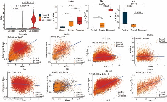 通过对重症COVID-19患者支气管肺泡灌洗液(BALF)的单细胞转录组数据进行分析,研究发现 NINJ1在单核/巨噬细胞中的表达水平与疾病严重程度及炎症反应呈正相关。
