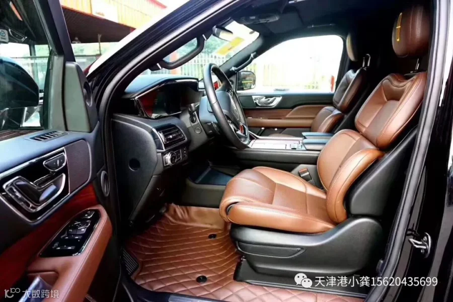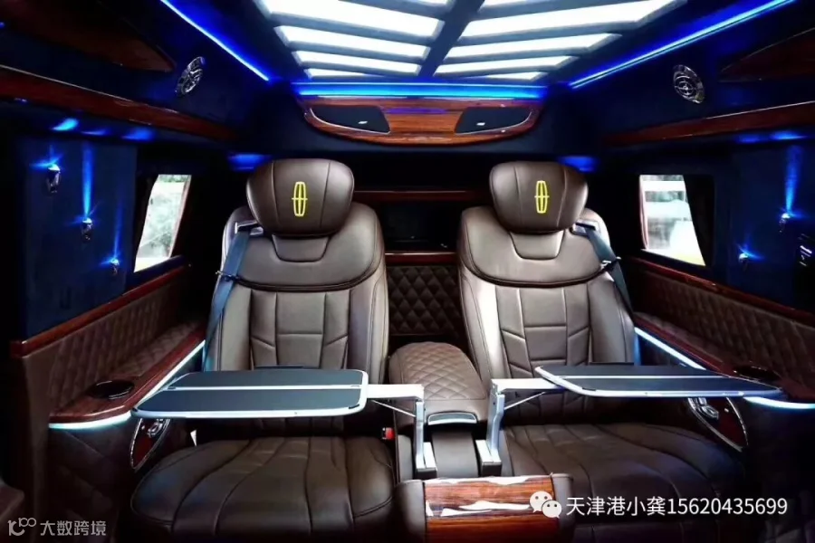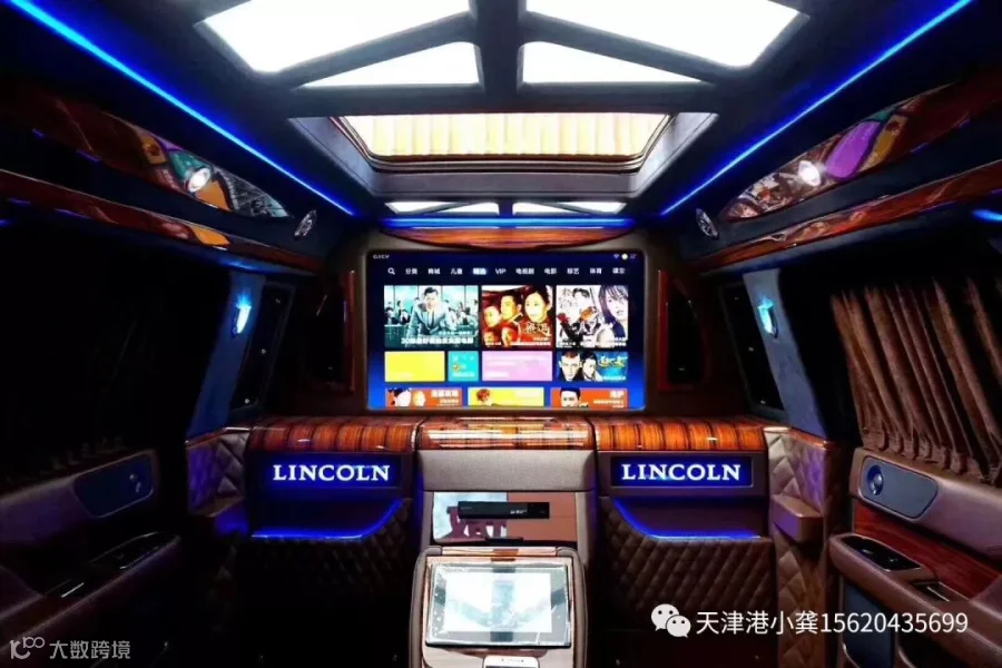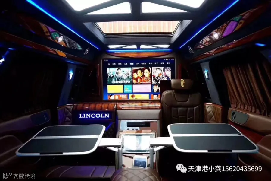林肯领袖一号后舱内饰;整车采用2+2+2座椅分布,2个电动隐藏座椅+中央电动吧台组合,可以成为一个小型会议室,地板是高级柚木地板,中间镶嵌铜条,手工制作,方便打理,2个航空座椅可以加热通风,180放平。全车内氛围灯都是经过法国设计师之手,无时无刻不体现浪漫。