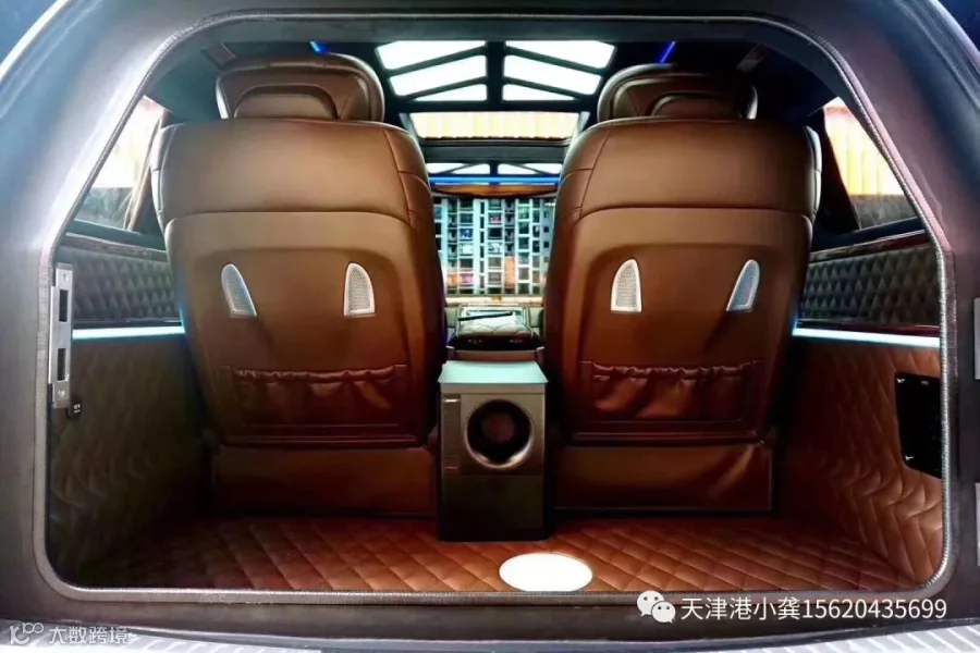 后舱超级VIP航空座椅12向电动调节带按摩及通风、加热、加2张电动隐藏式秘书座,带加热)3.5TT涡轮增压 378匹马力,智能卡无钥匙启动,8寸大屏导航倒车影像,电动踏板,VIP包围,LED大灯,氙灯,车内氛围灯,桃木多功能真皮方向盘 ,电动油门刹车踏板调节,方向盘电动调节,盲点辅助,前舱高级THXI音响系统,20轮 电动后尾门 ,电动踏板,后藏VIP总统级商务座椅,12向电动调节包含头枕自动升降,座椅通风,座椅加热,后藏独立空调系统,多点自动按摩,防蛋后尾门。全车德国Napa真皮,高级美国进口游艇PVC高度耐磨防滑地板,电动隐藏式进口胶囊式咖啡机,42寸超大屏高清电视(自动升降),后藏法国劲浪5.1声道环绕立体声发烧音响,支持高清蓝光播放,支持高速USB高清电影移动硬盘播放,支持4T高速硬盘蓝光高清电影播放,支持4G高速上网,支持手机智能互联,独立大容量USB充电接口以及12V应急电源插座及110V笔记本电脑供电插座,后藏2个独立储物空间,中间过桥试中控台,以及中控电动隐藏迷你咖啡吧,中间吧台内7寸触摸智能全车电器智能控