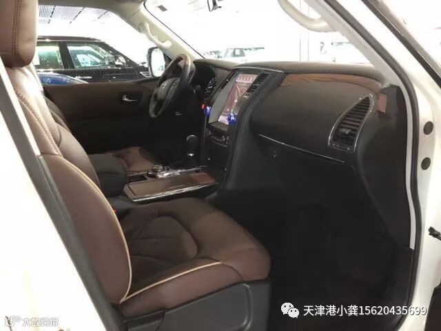 内饰方面:18款日产途乐Y62的外观好比金刚的话,其内饰就是给金刚加分的内秀,氛围反倒温馨了不少,真皮包裹与实木纹路对称式中控台,没有很奢华却也不失优雅,虽然不够时尚但是用料都是一等皮质包裹,豪华感十足;中控显示提供360度全景影像等,功能非常丰富,真皮包裹的四幅式方向盘具备加热功能,粗细均匀。此处旋钮是途乐之精华所在,四驱模式、多地形越野模式、陡坡缓降系统等都在这里操作。全新一代日产途乐Y62中东版全系底盘采用了最可靠的硬轴设计,后防请倾杆同样可有电动取消功能,方便越野,这是真正四驱迷们至爱而难得的硬派四驱车型。