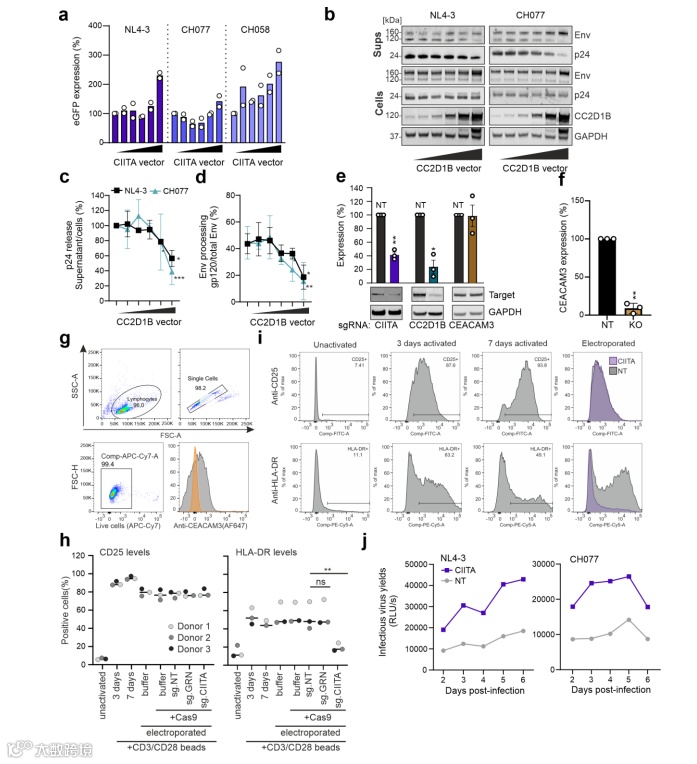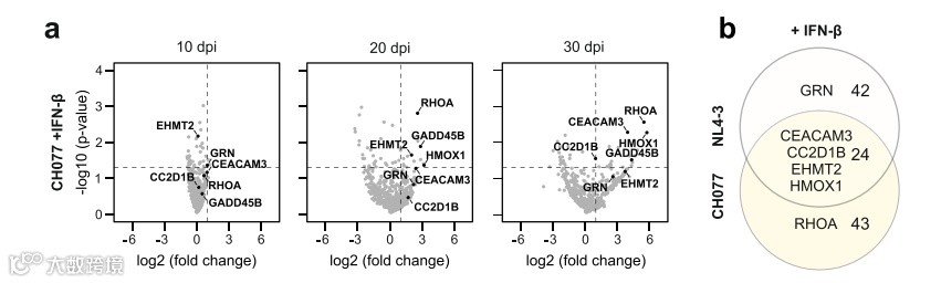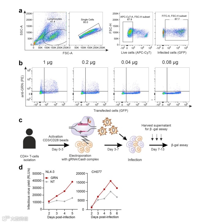 通过CRISPR/Cas9系统介导GRN、CIITA和CEACAM3基因在CEM-M7中的敲除后,研究各基因作用于病毒复制的哪些环节,他们发现GRN基因能直接抑制病毒的复制,而CIITA和CC2D1B基因通过抑制病毒的转录和释放从而达到抑制病毒复制的目的。