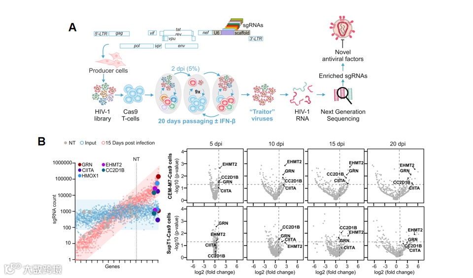 先天性抗病毒因子是有效抵御病毒病原体的关键。目前发现抗病毒因子的方法通常侧重于病毒复制的初始阶段,而且多数仅限于单轮感染。Prelli bozzo等人针对潜在与HIV病毒感染、逆转录、复制等生物学过程相关的511个基因设计了CRISPR敲除文库,并将这些sgRNA整合到具有复制能力的HIV病毒中,称之为“叛徒病毒”文库。使用HIV病毒感染CEM-M7细胞并于不同时间收集细胞上清后,通过NGS测序检测上清病毒中的sgRNA丰度。研究发现,随着感染时间的延长,细胞培养基上清的病毒中,针对 GRN、CIITA、EHMT2、CEACAM3、CC2D1B 和 RHOA 的 sgRNA 富集程度达50倍以上。