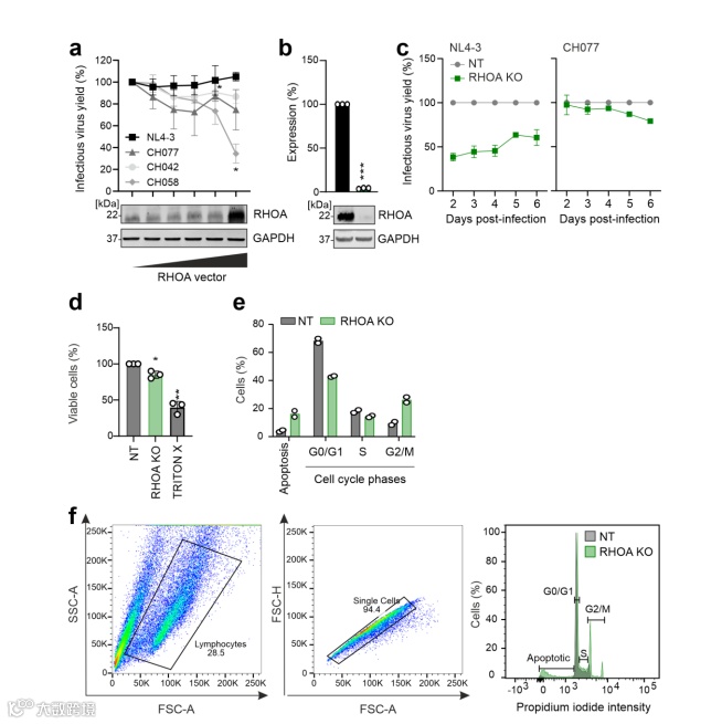 研究最初选用NL4-3病毒株是由于这株病毒在绝大多数的研究中都有应用,然而这株病毒能够在T细胞中进行高效复制,这可能会使得抑制病毒复制的病毒限制因子无法通过NL4-3构建的“叛徒病毒”文库筛选出来。因此研究者们又换用了CH077病毒株用于构建“叛徒病毒”文库进行筛选,结果表明,经CH077“叛徒病毒”文库筛选出的基因中CEACAM3、CC2D1B、EHMT2和HMOX1基因与NL4-3“叛徒病毒”文库筛选结果重叠,而RHOA基因仅在CH077“叛徒病毒”文库筛选中被富集。研究者们进一步通过基因敲除单独对RHOA基因进行了验证。
