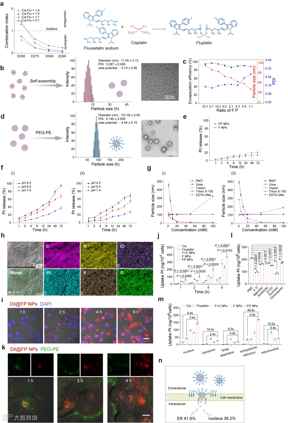 本项研究中,首先验证了肿瘤治疗期间顺铂进行性化疗耐药的一些可能机制,包括伴随着TP53突变风险增加,顺铂耐药性也增加。为解决这一问题,研究人员合成了由顺铂与氟伐他汀组成的Fluplatin并构建了最终制剂FP NPs。FP NPs不受p53突变的限制,靶向内质网后降解突变p53,并高效引发内质网应激,从而独立于p53途径发挥了有效的抗肿瘤作用。FP NPs减缓肿瘤进展,并体现出大幅度改善p53突变所带来的不良预后的潜力。