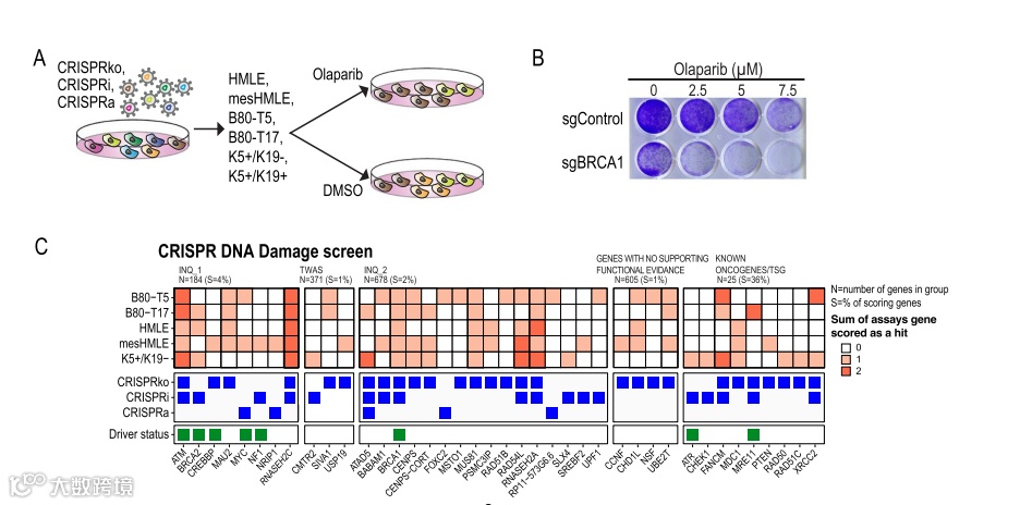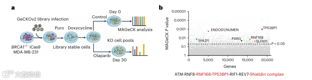 筛选方法:在含有多西环素(doxycycline)的条件下培养细胞,以诱导Cas9的表达,然后加入PARP抑制剂奥拉帕尼(olaparib)进行筛选。