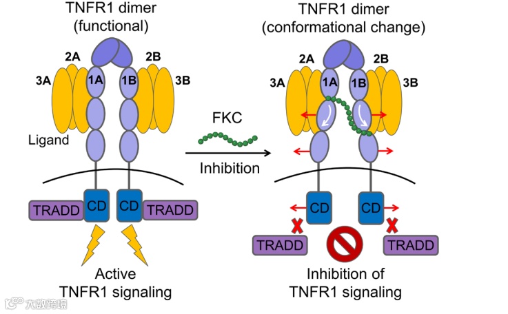 FKC肽作为变构抑制剂,不通过阻断配体结合或破坏受体间相互作用来发挥作用。受FKC肽甚至能够防止其他小分子(如Zafirlukast)破坏TNFR1的受体间相互作用。