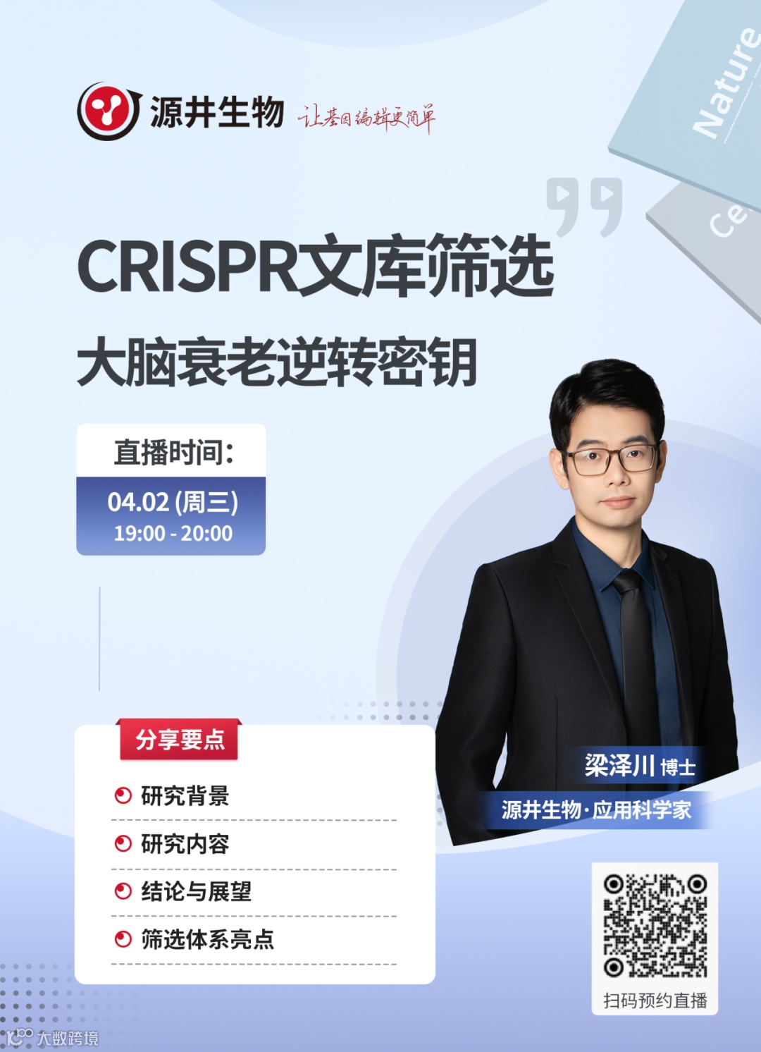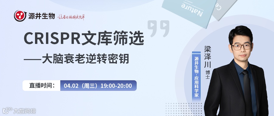 4月2日19:00,源井生物应用科学家梁泽川博士带来主题为<如何在衰老模型中活用CRISPR文库筛选——解码大脑衰老逆转的基因密钥>的精彩直播。同时,我们还设置了问题答疑环节,让您和技术专家直接对话!