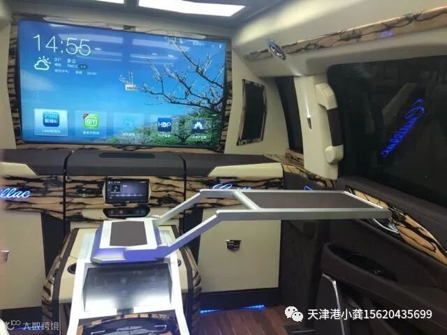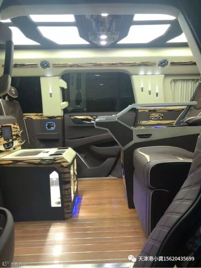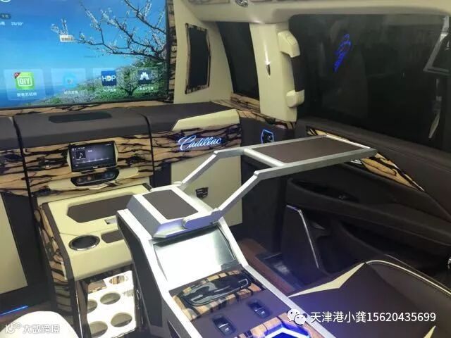 凯迪拉克总统一号隐藏六座商务车内饰部分:舱内隔断:可升降分隔屏,32寸超薄液晶电视 音响设备:BOSS环绕音响,DVD 舱内灯饰:氛围灯 LED灯饰,迈巴赫棚顶灯 舱内吧台:酒柜 咖啡机舱内桌板:电动隐藏式伸缩桌板 地板材质:柚木地板 舱内天窗:全景开启式大天窗。