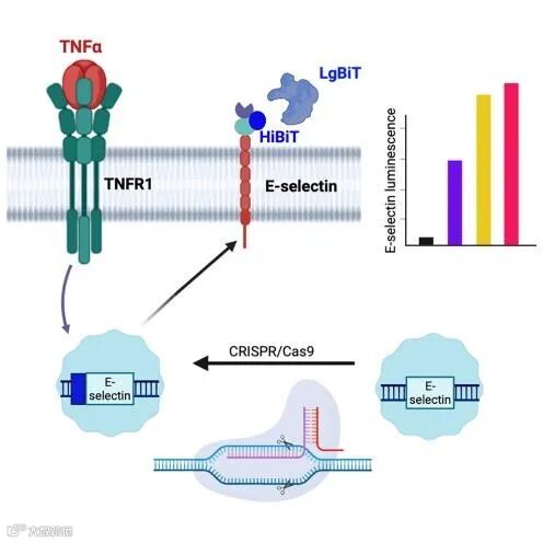 E-选择素是一种内皮细胞上表达的糖蛋白,在许多病理过程中具有重要作用。Ogrodzinski Lydia及其团队[6]利用CRISPR Cas9技术和NanoBiT技术开发了一种工具,可实时监测细胞表面E-选择素的表达情况,从而灵敏地探测不同炎症细胞因子或配体对E-选择素表达的影响。在这项研究中,作者在永生化HUVEC细胞系中使用CRISPR Cas9技术将HiBiT标签蛋白敲入E-选择素的N端,同时外源加入不能穿过细胞膜的LgBiT蛋白。当LgBiT蛋白与HiBiT标签融合时,会产生光信号,从而实现对E-选择素的荧光检测。结果显示,TNFα、IL-1α、IL-1β、LPS、VEGF 165a和组胺等炎症因子或配体诱导后,原代细胞和永生化细胞中E-选择素表达情况相似。此外,作者还评估了这些细胞在生成血管和形成新血管方面的表现。他们发现原代HUVEC、永生化HUVEC和HiBiT-E-选择素-TERT2-HUVEC均能够在3D培养基中形成微血管。然而,由于原代细胞无法形成单克隆,每次实验都需重新转染以获得表达HiBiT标签-E-选择素的HUVEC细胞。而且基因编辑效率低下会导致原代细胞的发光输出减少,更易受其他因素的影响。但永生化细胞可以使每次实验的发光输出更为一致,因此可以实现对E-选择素更详细的活细胞动力学实时监测,这将会成为未来炎症药物开发的强有力工具。