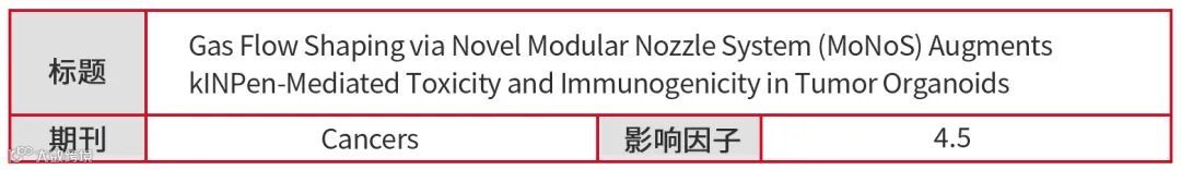 作者开发了一种新型的模块化喷嘴系统(MoNoS),通过改变气流特性来增强kINPen介导的肿瘤类器官毒性和免疫原性。该研究采用CT26-LUC细胞系以评估MoNoS系统在体外实验中对肿瘤细胞毒性的影响,以及在体内(in ovo)模型中对肿瘤生长的影响和治疗的免疫原性[5]。