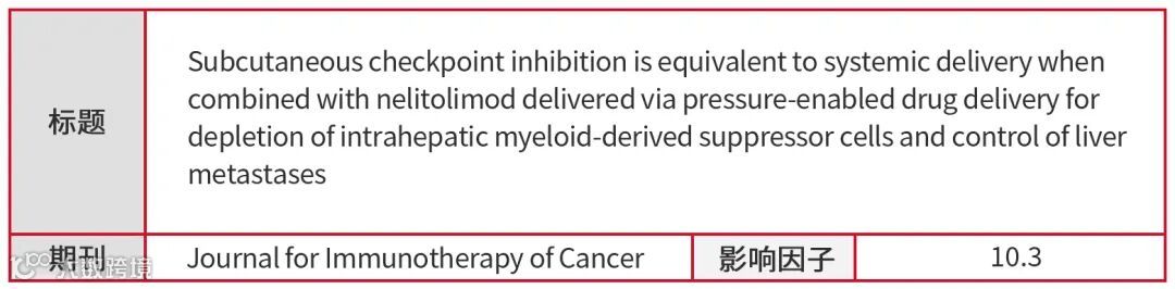 作者使用源井生物构建的MC38-Luc细胞来建立小鼠肝转移(LM)模型,发现皮下递送检查点抑制剂(CPI)与PEDD系统递送nelitolimod(一种TLR9激动剂)联合使用时,在控制肝肿瘤发展的效果与全身系统给药途径相当,这表明皮下递送CPI与nelitolimod联合使用可能是治疗肝肿瘤的合理选择[4]。