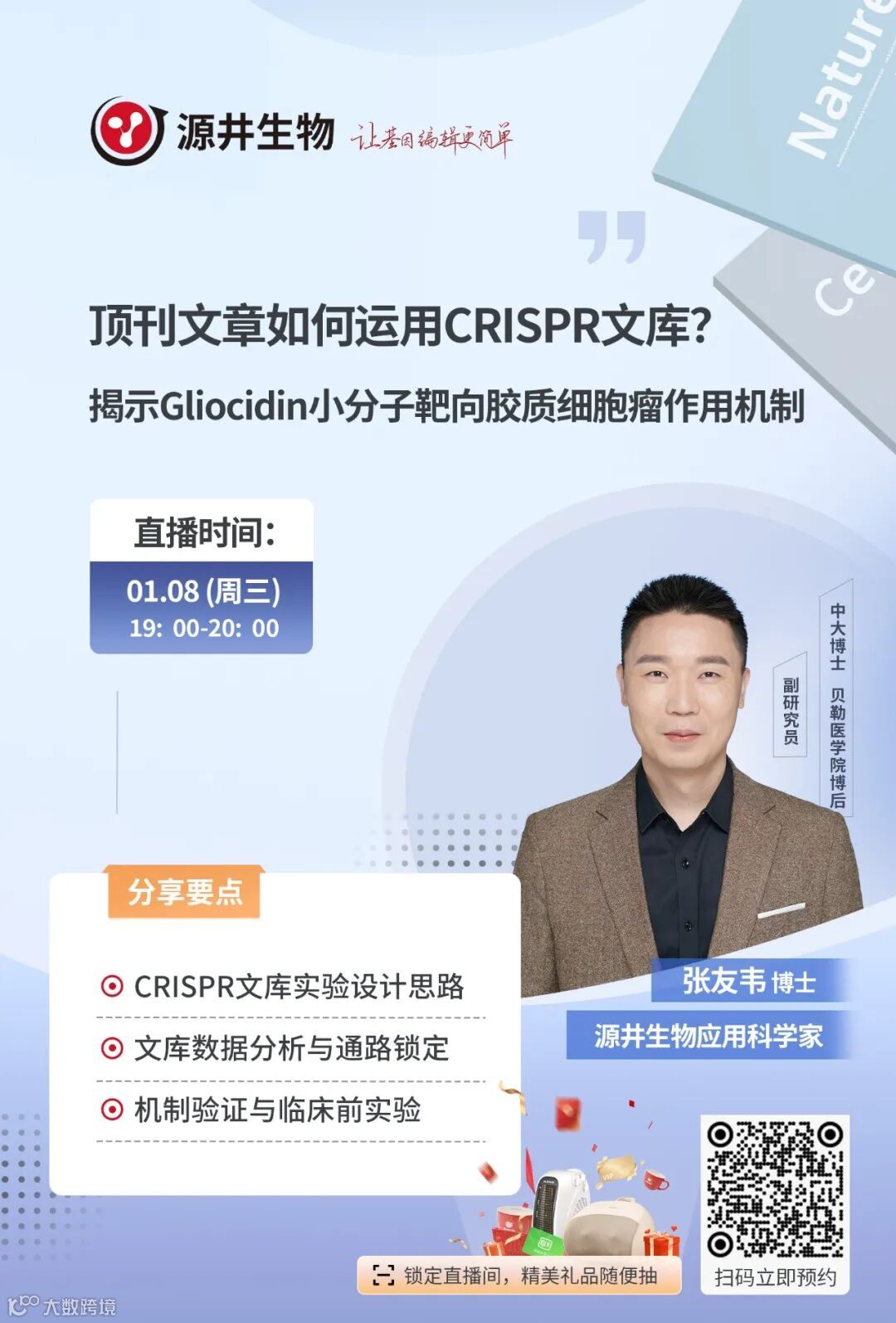 将在2025年1月8日晚上19:00,源井生物应用科学家张友韦博士给大家带来一场关于CRISPR文库筛选前沿应用直播,本次直播聚焦于脑癌领域的应用,最后还有问题答疑与探讨环节。更有惊喜彩蛋等你来抽!